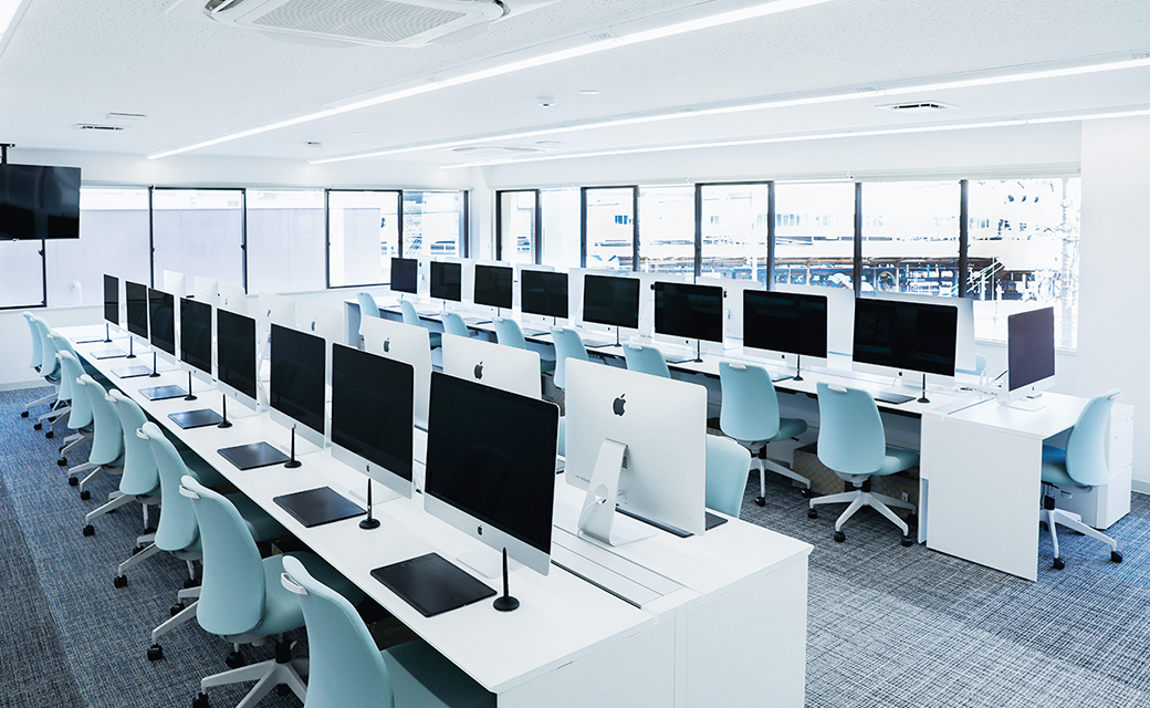 最新パソコンと液晶タブレットを完備した充実の環境で学べる!岡山駅西口から歩いてすぐの好立地。最新クリエイティブパソコンと液晶タブレットを完備した充実の環境で技術を磨き、憧れの業界を目指そう!