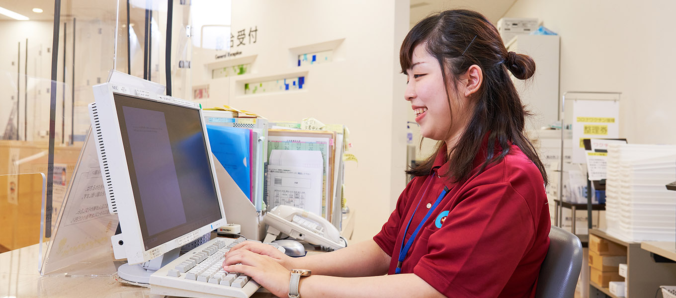 患者様の受付・問診などの受付業務のほか、外来診療費・入院費の計算と会計、カルテ入力、診療報酬請求業務、SNSの更新など、幅広い業務を担当しています。新しい発見や気づきを通して知識が身につき、一人でできることが増えていくのが楽しいです。