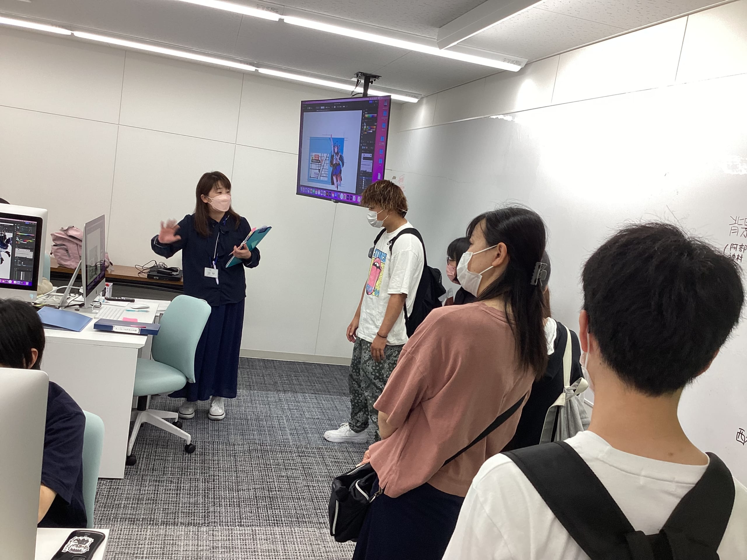 岡山駅西口キャンパスでは、アニメ・イラスト学科の動画制作の授業やIllustratorを使用した名刺作りの授業見学、eスポーツビジネス学科ではeスポーツ実習の授業見学をしていただきました。