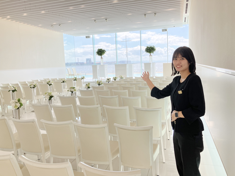 「頼れるマネージャーや先輩、支えあえる同期がいるので仕事を頑張れます。美しい神戸港のオーシャンビューの敷地に、海に浮かぶようにたたずむ、明るく開放的なチャペルが魅力のこの会場が大好き。ウェディングコーディネーターという仕事は楽しいです!」と話してくれました(^-^)