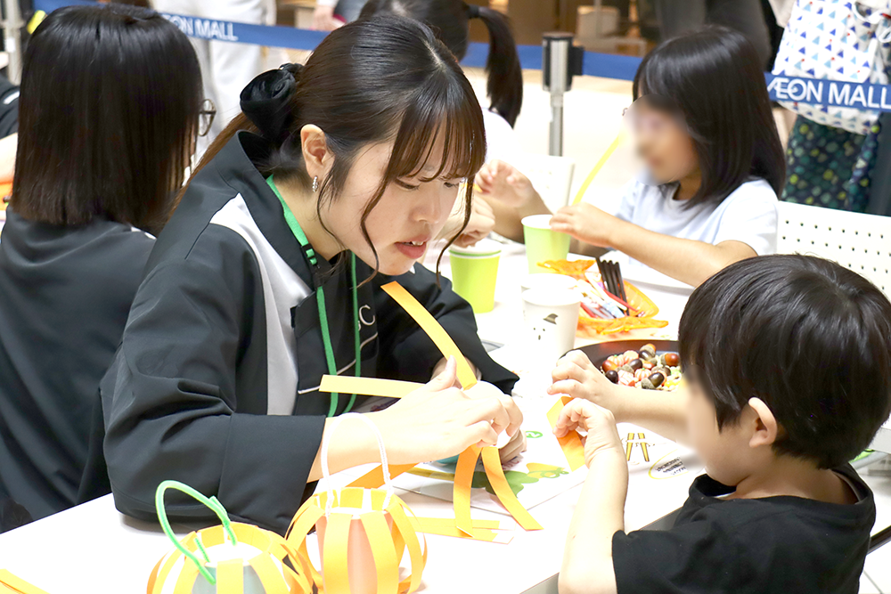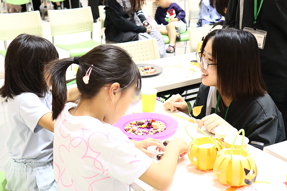 調理師養成学科ではかわいいかぼちゃの入れ物を作って、板前さん気分でお箸を使っておまめのつかみ取りに挑戦!