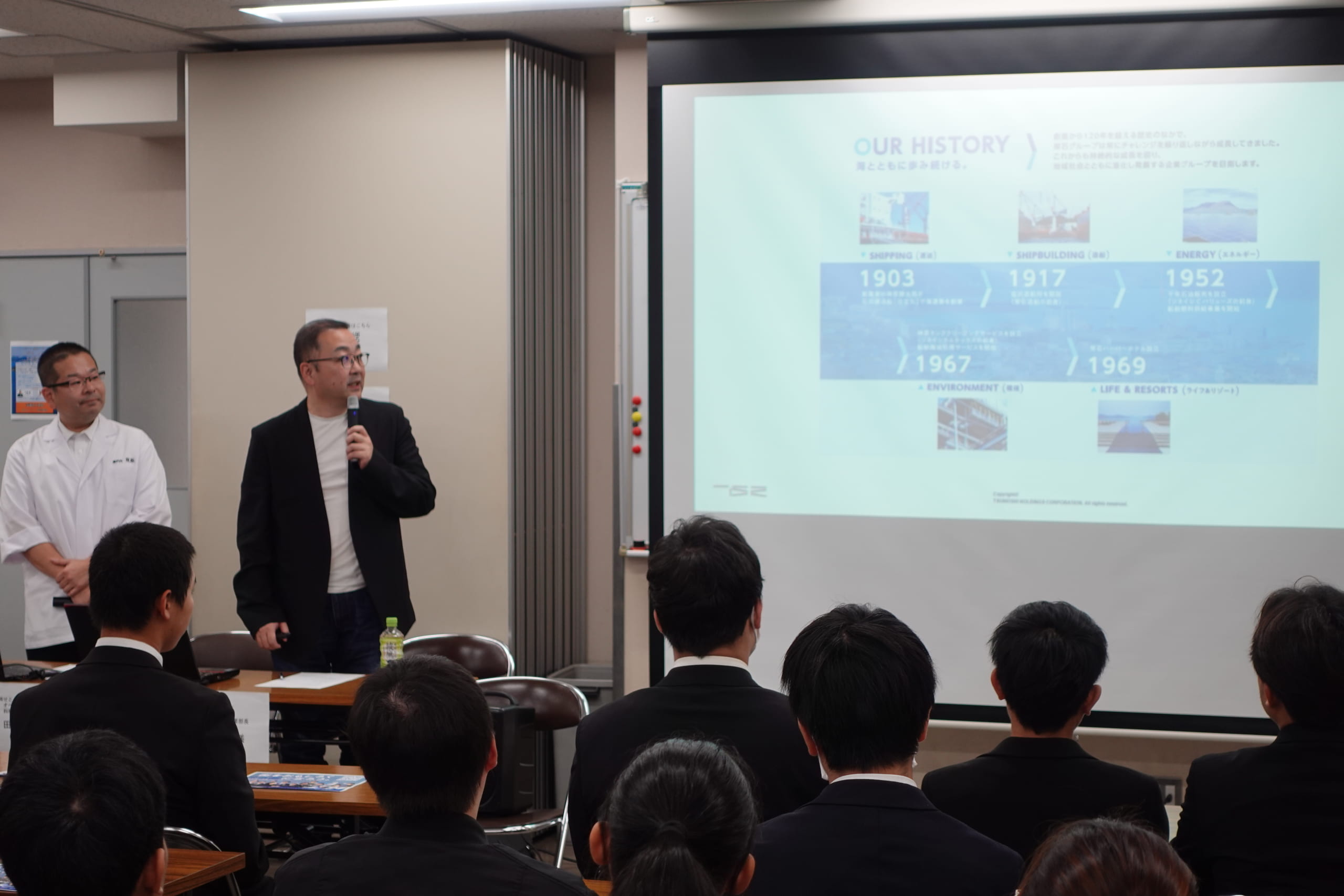 講話は企業紹介と学生からの質問にリアルタイムで回答いただく流れで行われました。