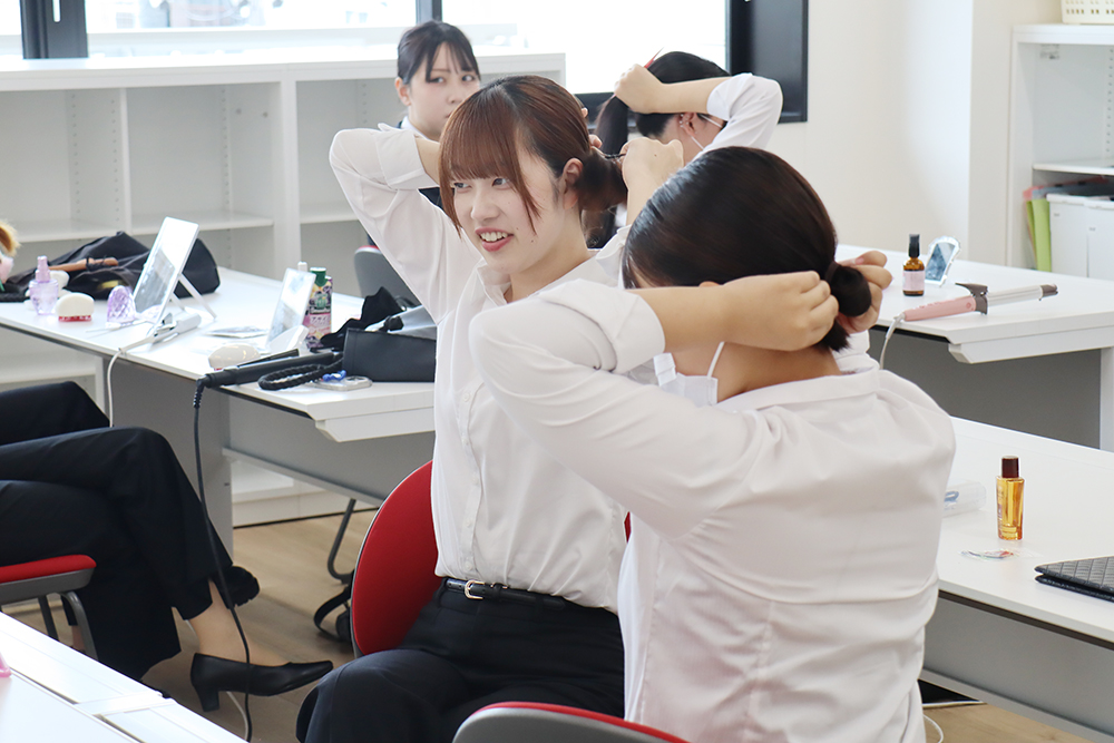 姉妹校専門学校岡山ビューティーモード(OBM)の先生や学生たちに協力していただき、ヘアメイク&メイク講座を行いました(*^^*)