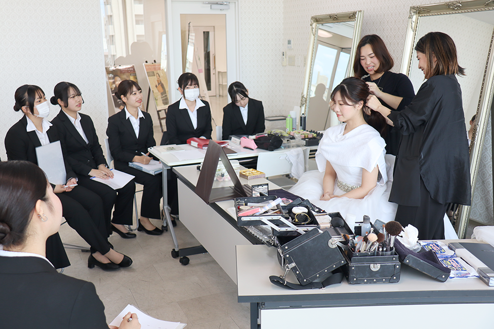 今回のスペシャル授業では、今のブライダルの流行スタイルや、お仕度をする際にどんな点に気を付けて着付けやヘアメイク、仕上げを行っているか説明を聞きながら、花嫁さんが変身していく過程を学ぶことで、将来ウェディングプランナーやドレススタイリストとして活躍する際に、提案の幅が広がったり、花嫁さんの気持ちを理解できるようにすることが目的で、毎年行っている授業でもあります★