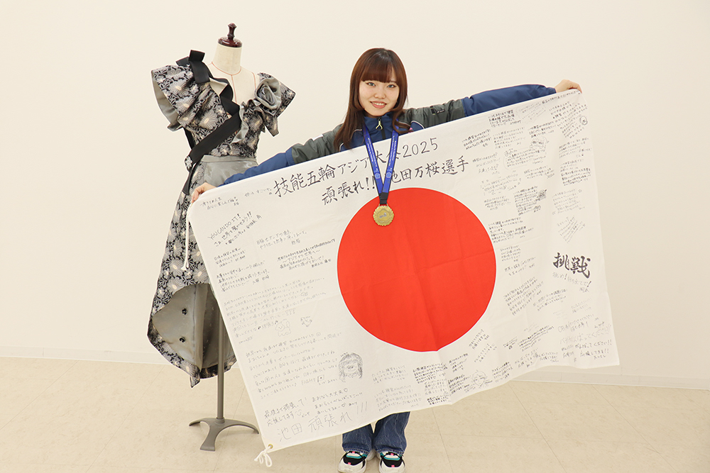 技能五輪アジア大会洋裁職種で初の日本代表として出場し、敢闘賞(第4位)を受賞!初の国際大会での結果と経験は、「日本の技術は世界に通用する」という揺るぎない自信となり、来年上海で開催される国際大会への大きな一歩となりました。不安もありましたが、新たな課題への挑戦が楽しかった。苦しい練習の日々もすべて自分の力になると確信しています。競技を通じて得た興奮と悔しさ、もっと挑戦したいという気持ちを胸に、私はさらに高みを目指します。