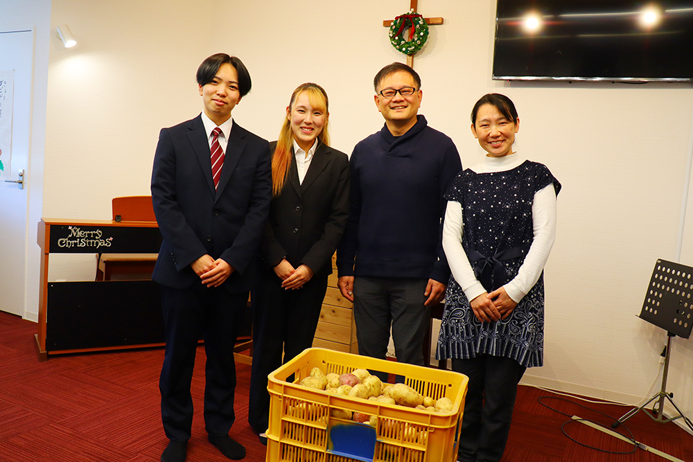瀬戸内市の耕作放棄地をよみがえらせようと取り組む「瀬戸内市ミニファーム~小さな畑から地域をつなぐ~」プロジェクトの一環として、12月22日(月)、こども食堂「いちわのすずめ」(瀬戸内聖書バプテスト教会)へ 専門学校岡山ビジネスカレッジ ビジネス・コミュニケーション学科の学生がじゃがいも約60kgを寄付しました。