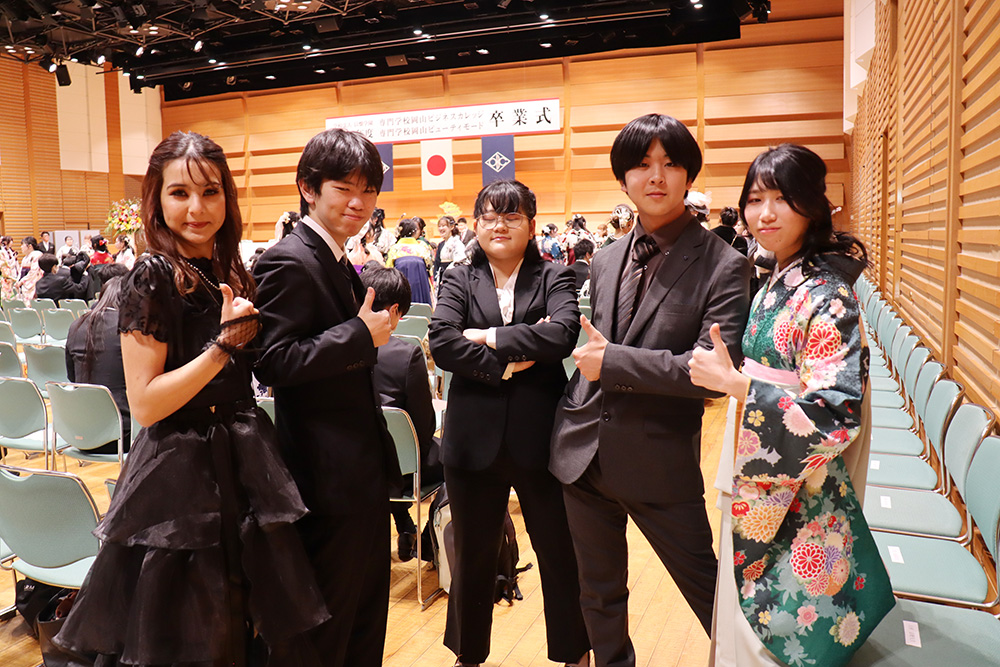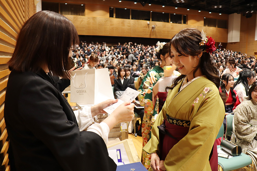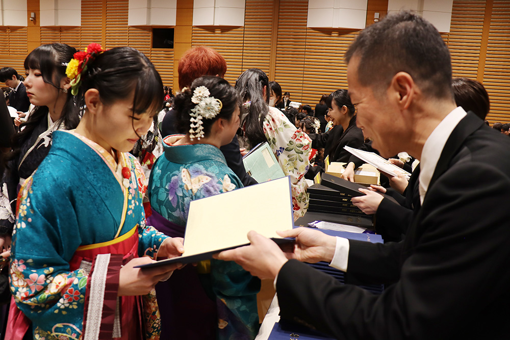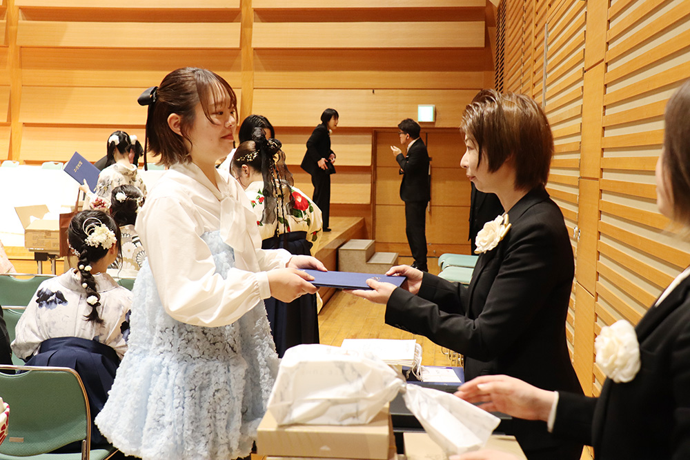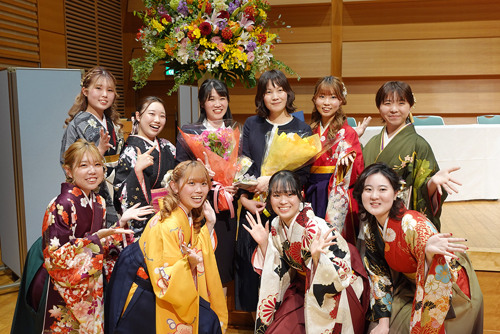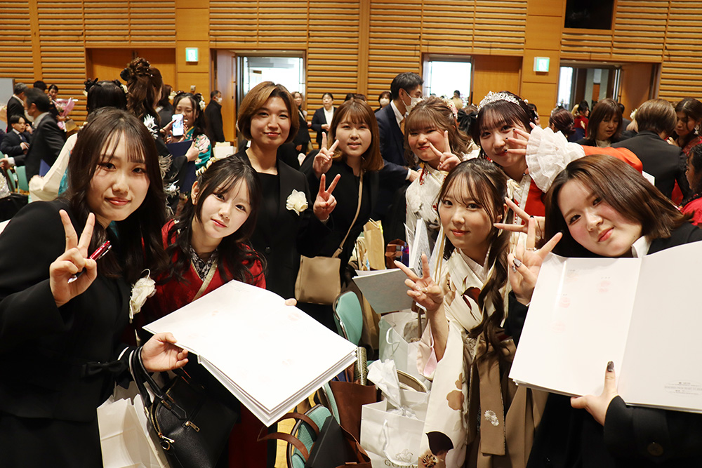 式終了後は、学科ごとに卒業証書の授与が行われ、クラスメイトや、お世話になった先生方との撮影タイムに。