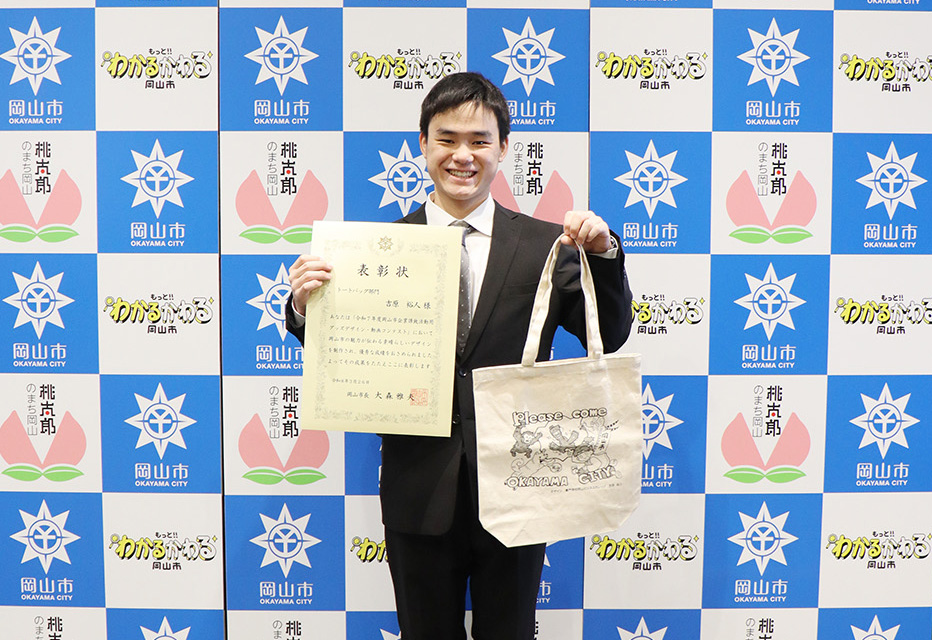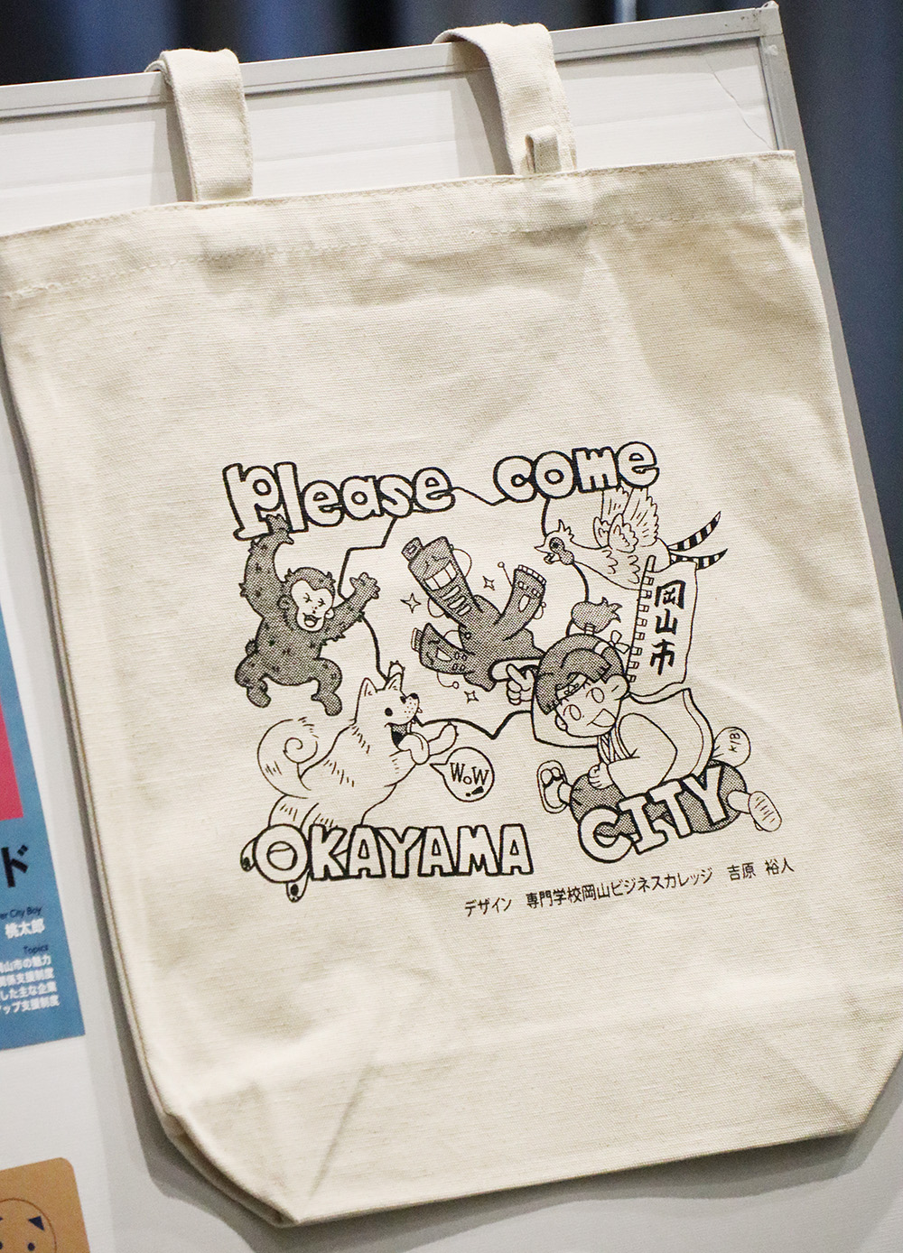 岡山市内のデジタルコンテンツ系専門学校の4校が競い合う「岡山市企業誘致活動用グッズデザインコンテスト」において、本校アニメイラスト学科1年生の作品が、トートバッグ部門で最高賞である「最優秀賞」を受賞しました!