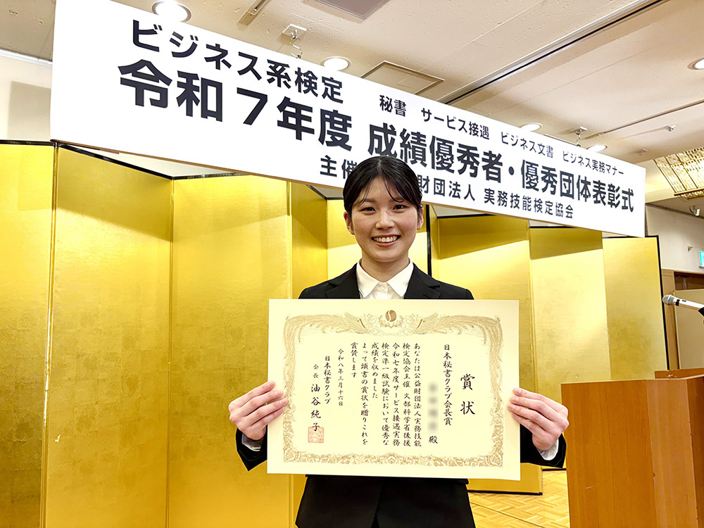 さらに嬉しいニュースとして、サービス接遇実務検定(準1級)において、本校ブライダル学科1年生(受賞時)が「日本秘書クラブ会長賞」を受賞いたしました。