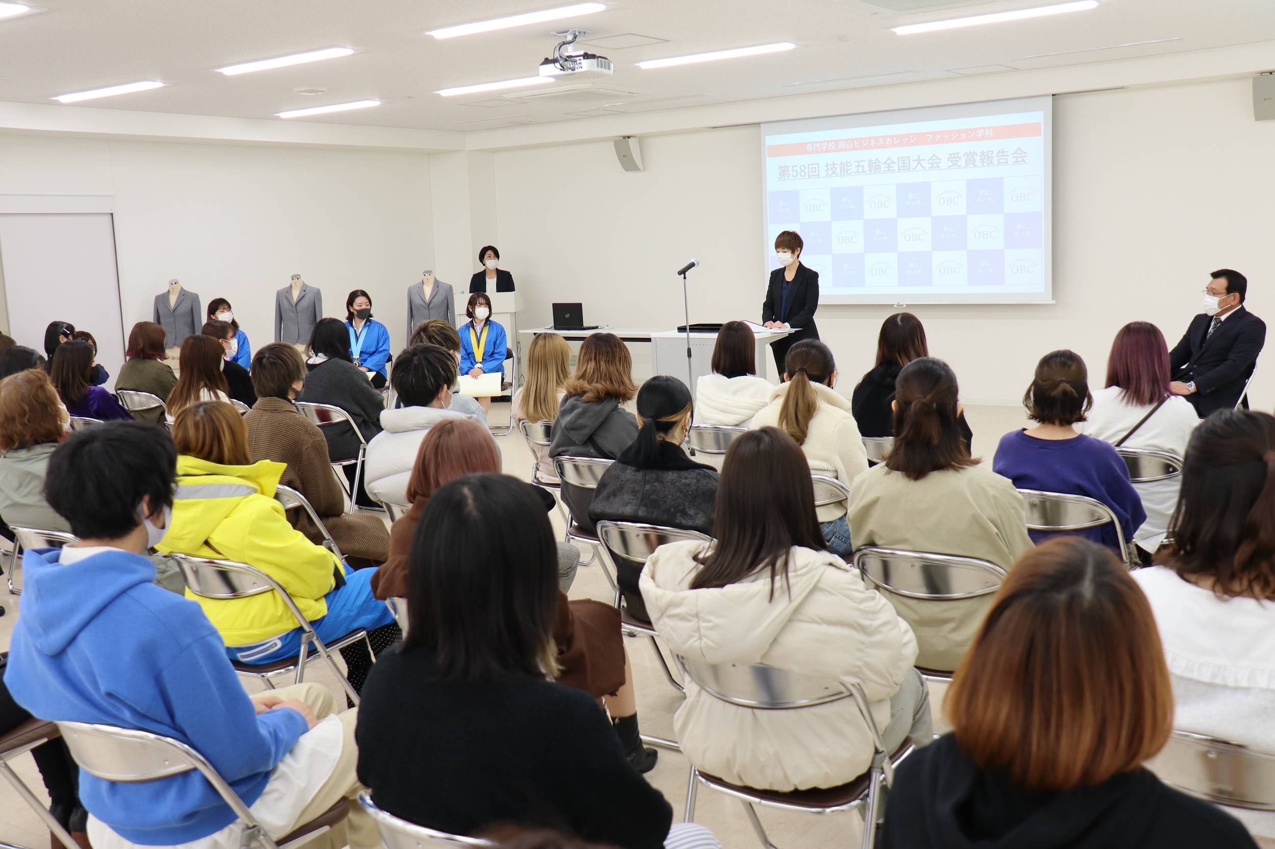 受賞者の挨拶や記念品の贈呈、指導を担当した岡本先生からの言葉など、クラスメイトであるファッション学科の学生たちが見守る中、和やかな雰囲気の会となりました。