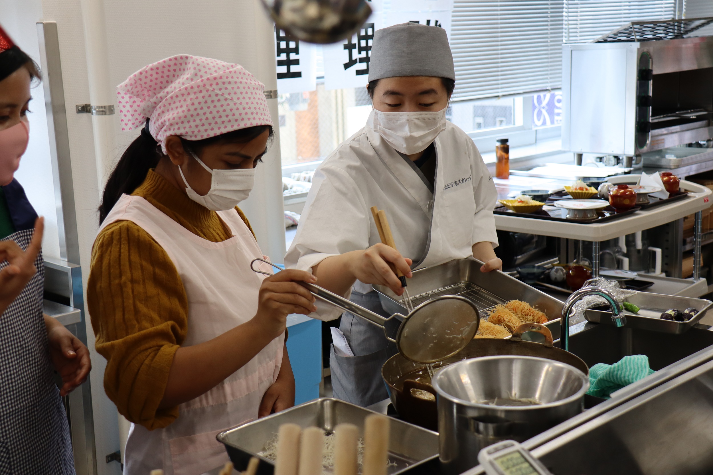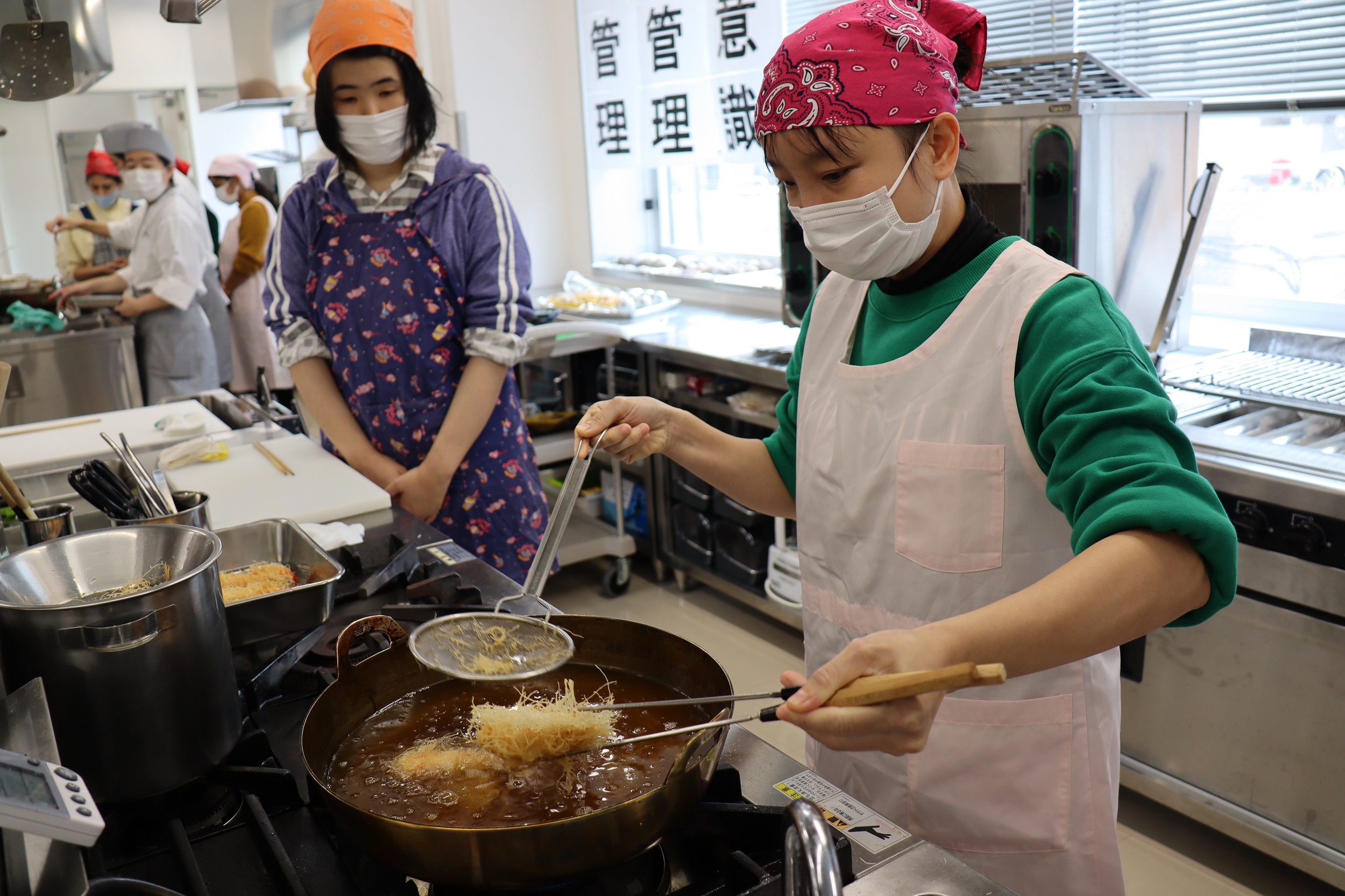 和食調理学科の学生は班ごとに作業の指導をしながら、季節の食材を取り入れる和食の特徴を説明したり、器や器具の説明をしたり、身につけた知識や技術を人に伝える楽しさや難しさを経験しました。