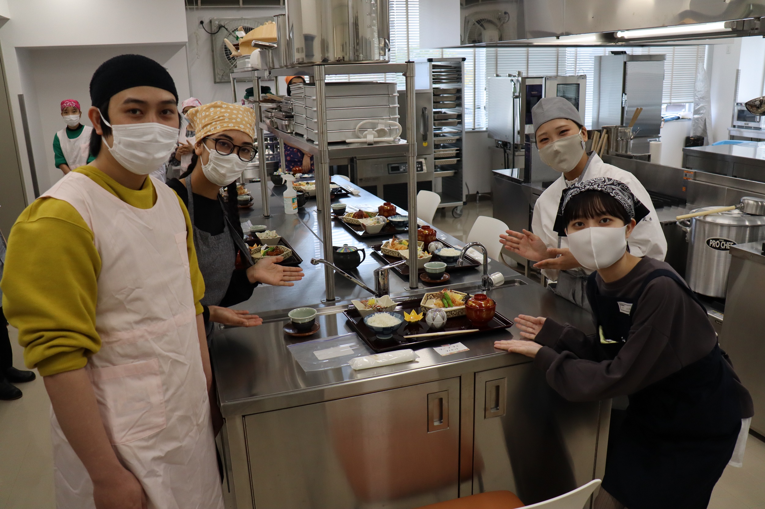介護福祉学科の学生は調理実習を通じて、食材や調理法だけでなく、日本の食文化や和食のおいしさを学びました。『和食について楽しく勉強ができた』、『一緒に実習ができて良かった』、『料理がおいしかった』、『今後に役立つ』などの感想があがり、両学科学びの多い時間を過ごすことができました。