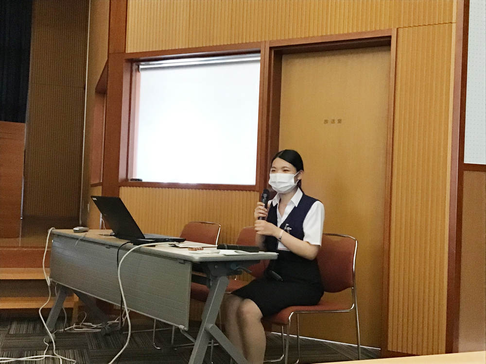 まず、大講堂にて、事務部職員の方々より、病院概要や施設・設備の詳細についての説明を受け、感染対策のため、診察室や入院患者様の病棟や病室、手術室などは、スライド写真にて詳しくご説明いただきました。
