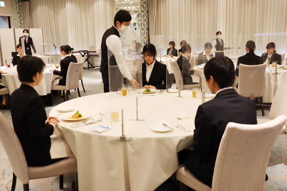 実施前の検温や手洗い、手指消毒の徹底、パーテーションなど、新型コロナウイルス感染予防対策もしっかり講じられており、学生たちは安心して研修に取り組むことができました。