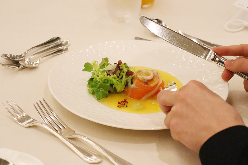 研修では美味しいお料理をいただきながら、ナイフ、フォーク、ナプキンの正しい使い方など洋食の基本マナーを教えていただきました。