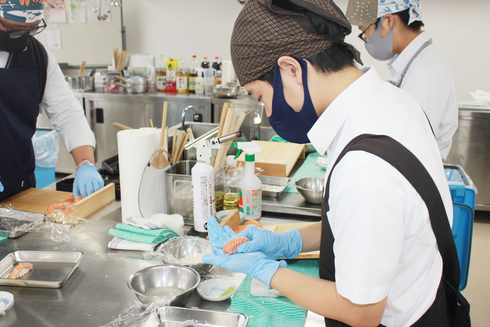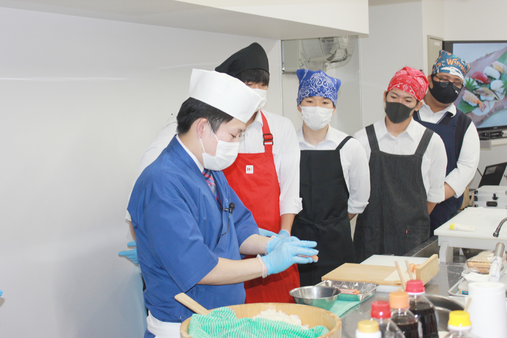 まずは講師の実演を見学してもらい、その後各班に分かれてシャリを合わせる工程から、握り寿司、盛り付けを行い、その中の数貫は炙りにしました!
