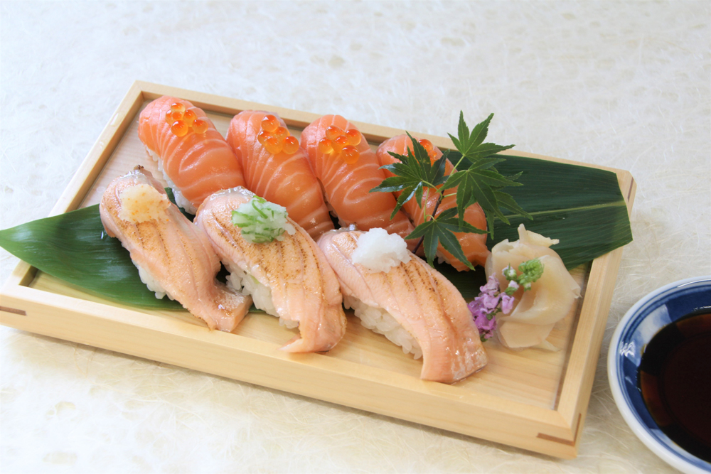 メニューは寿司ネタの中で若者に一番人気とされているサーモンの握り寿司です☆